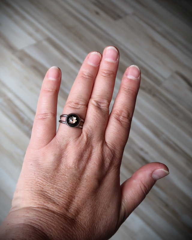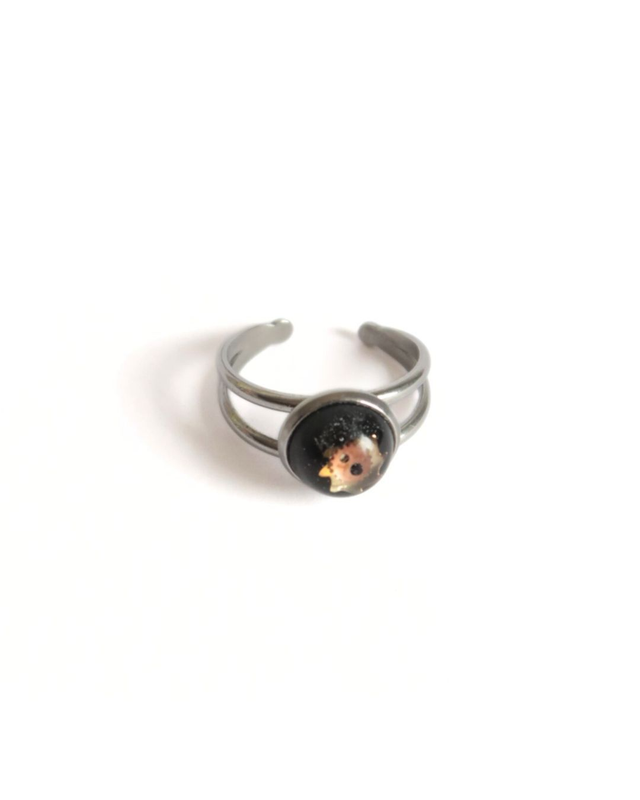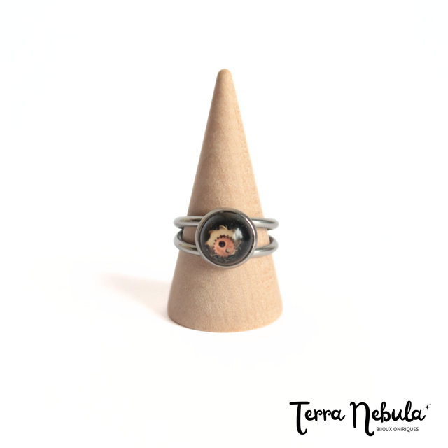 Bague composée d'un cabochon de diamètre 10 mm en résine époxy, mini engrenages, colorant noir et d'une base en acier inoxydable. Taille unique et réglable. Présentation en écrin noir