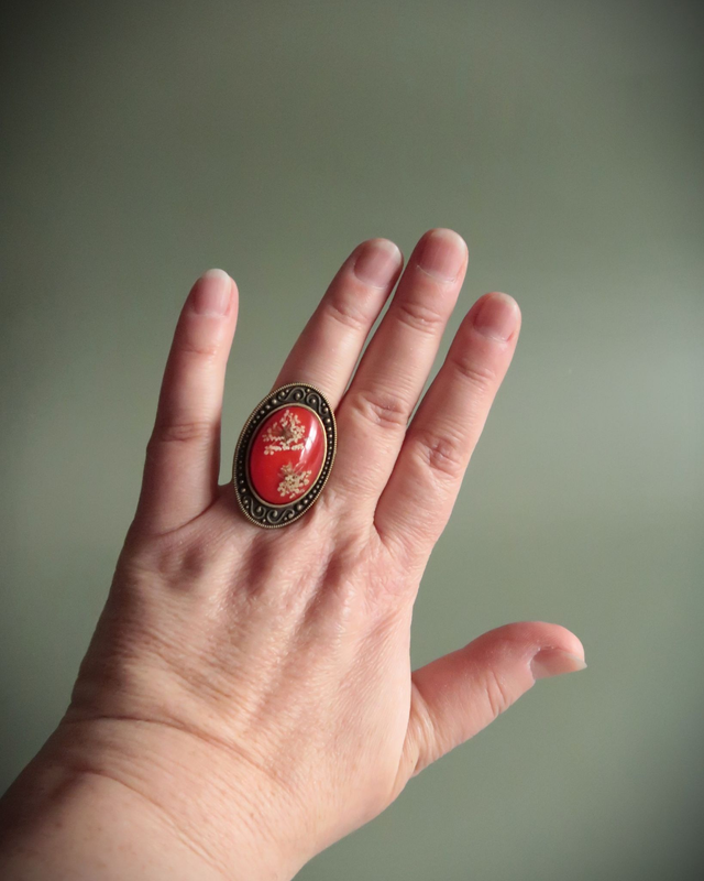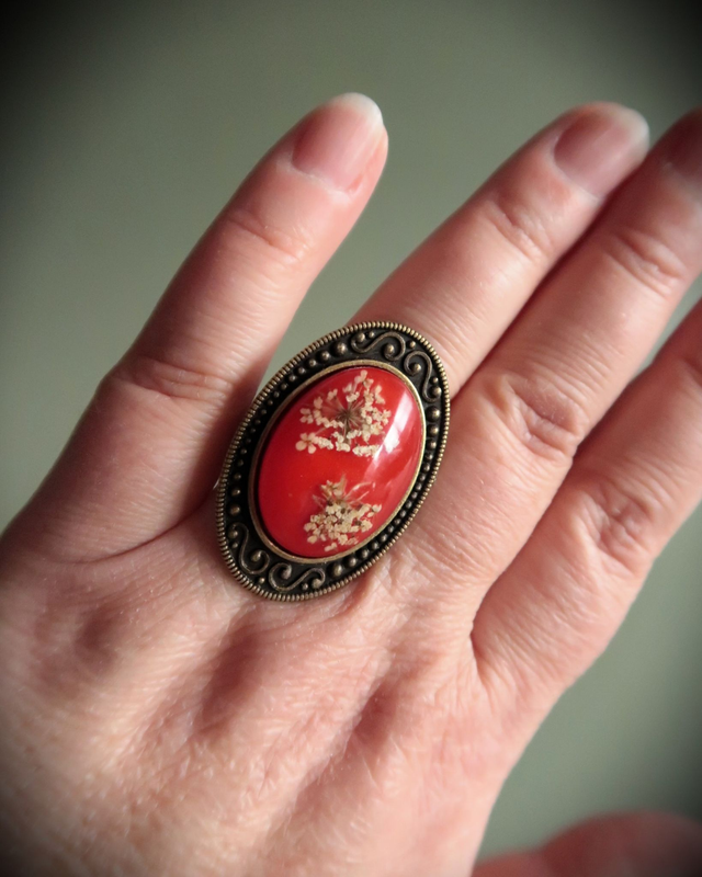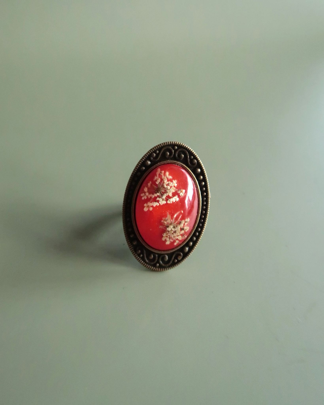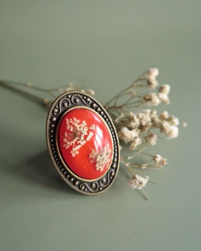 Bague composée d'un cabochon de 18x25 mm en résine époxy, fleurs de carottes sauvages cueillies et séchées par nos soins, colorant et base couleur bronze en alliage garanti sans plomb, sans nickel et sans cadmium. Taille unique & réglable.