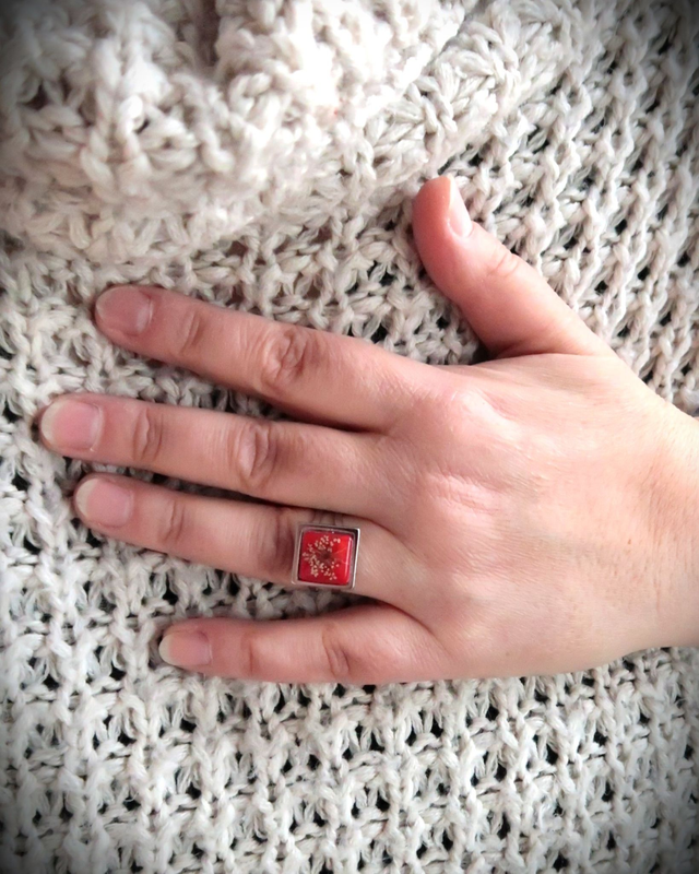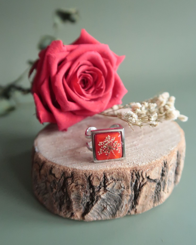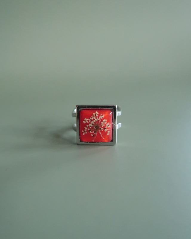 Bague composée d'un cabochon de 12x12 mm en résine époxy, colorant et fleurs de carottes sauvages séchées. Base en acier inoxydable. Taille unique & réglable.