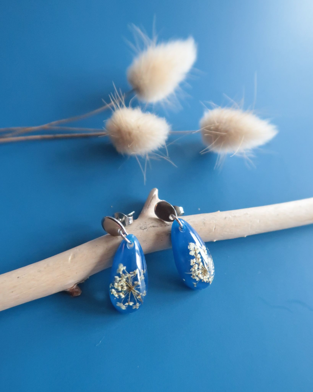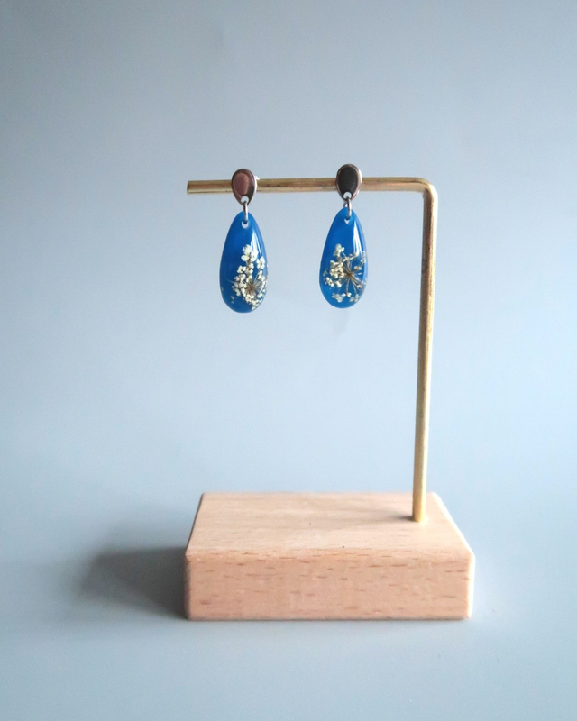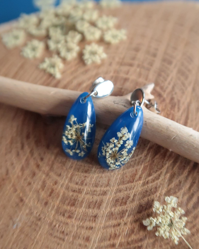 Boucles d'oreilles composées de résine époxy, colorant, fleurs de carottes sauvages et apprêts en acier inoxydable.