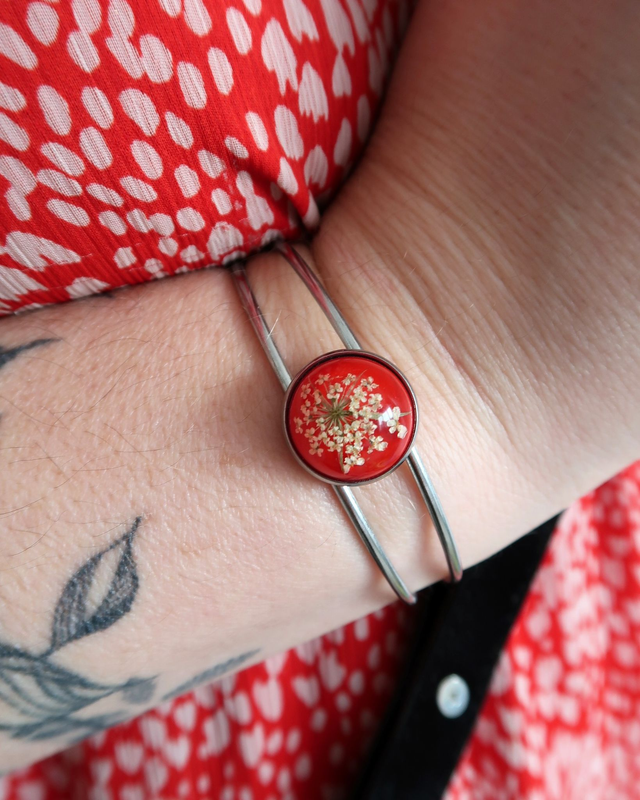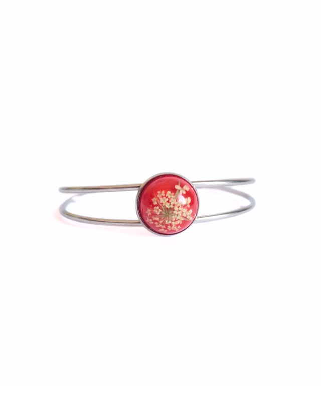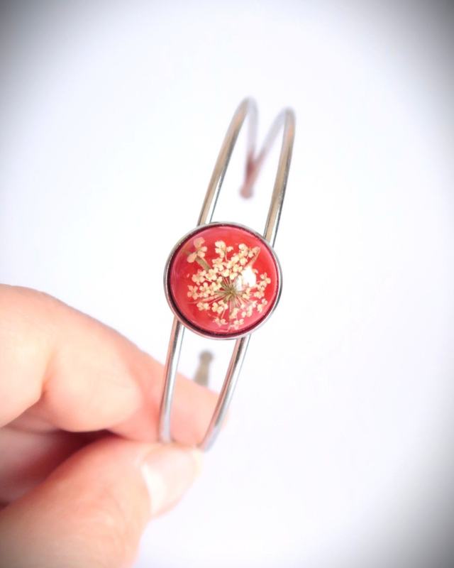 Bracelet composé d'un cabochon (16mm) en résine époxy, colorant rouge et fleurs de carottes sauvages séchées, bracelet en acier inoxydable. Taille réglable.