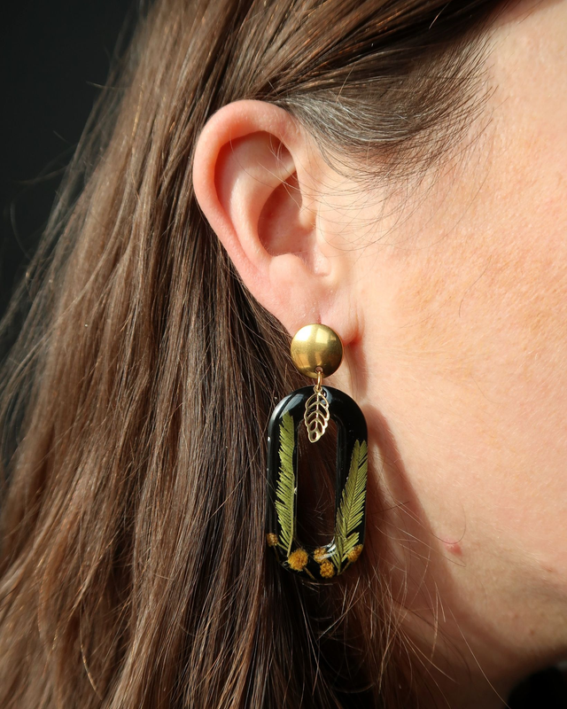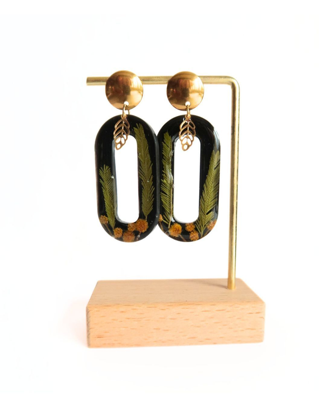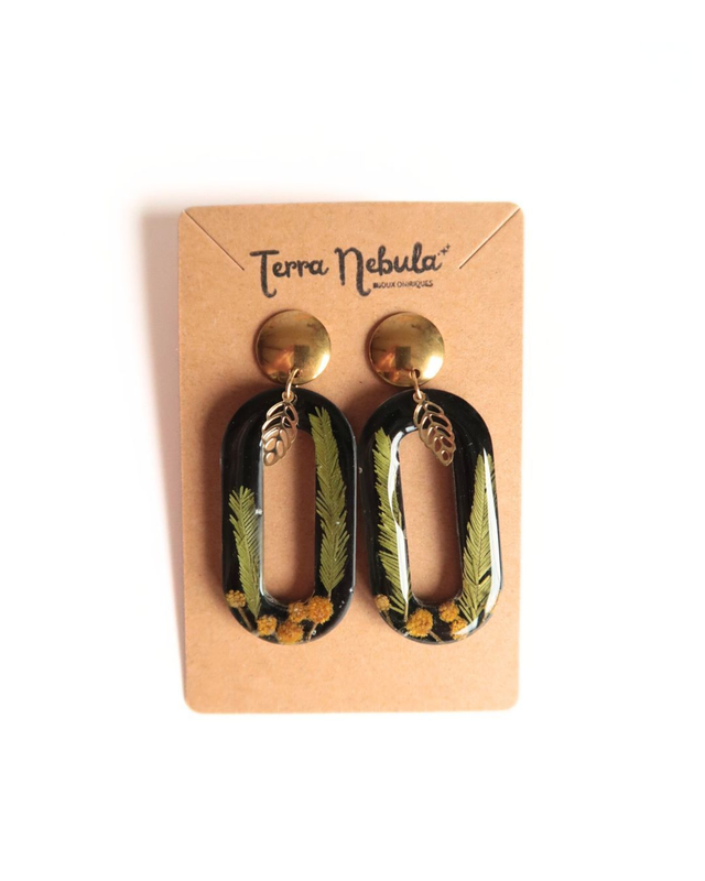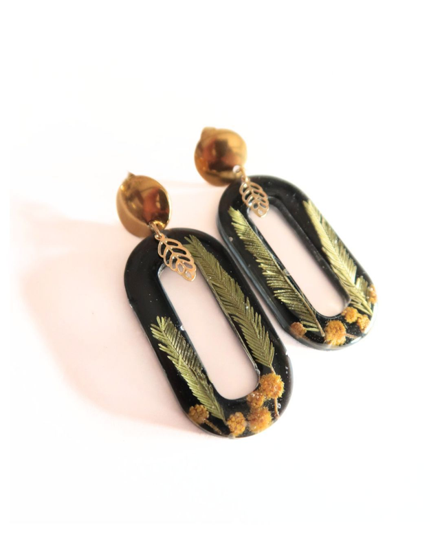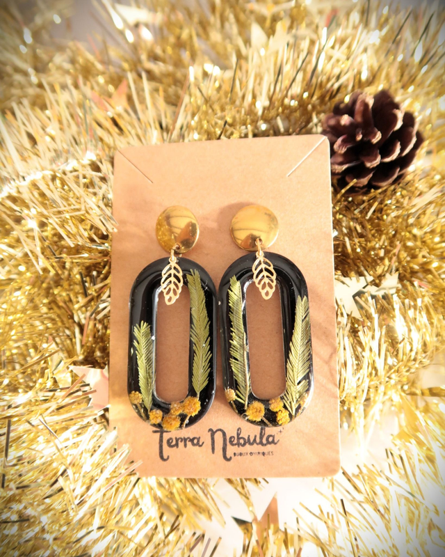 Grandes boucles d'oreilles onirique composées de résine époxy, colorant noir, fleurs et feuilles de mimosa séchés, apprêts et et boucles en support en acier inoxydable doré.