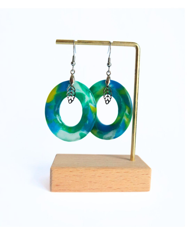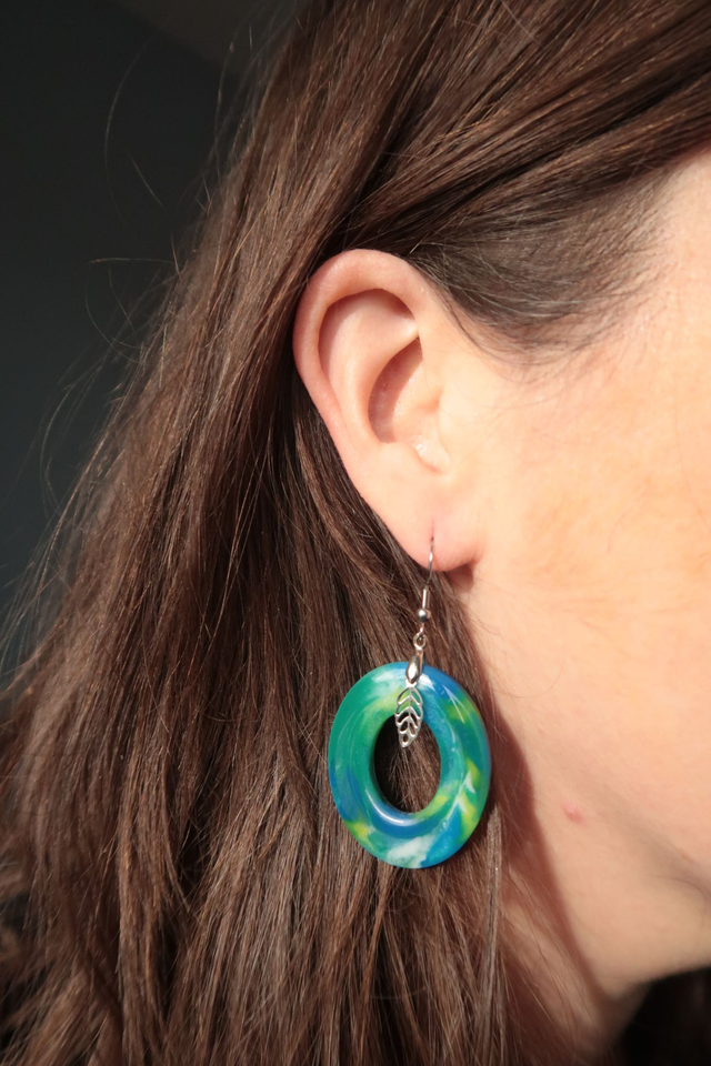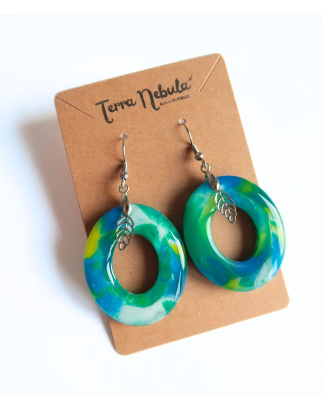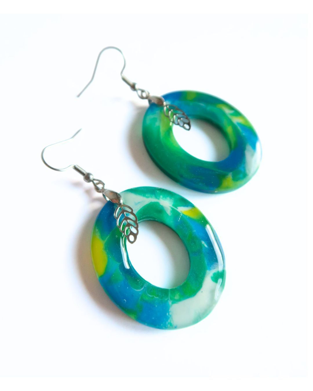 Grandes boucles d'oreilles onirique composées de résine époxy, colorants, bélière en laiton et boucles en support en acier inoxydable.