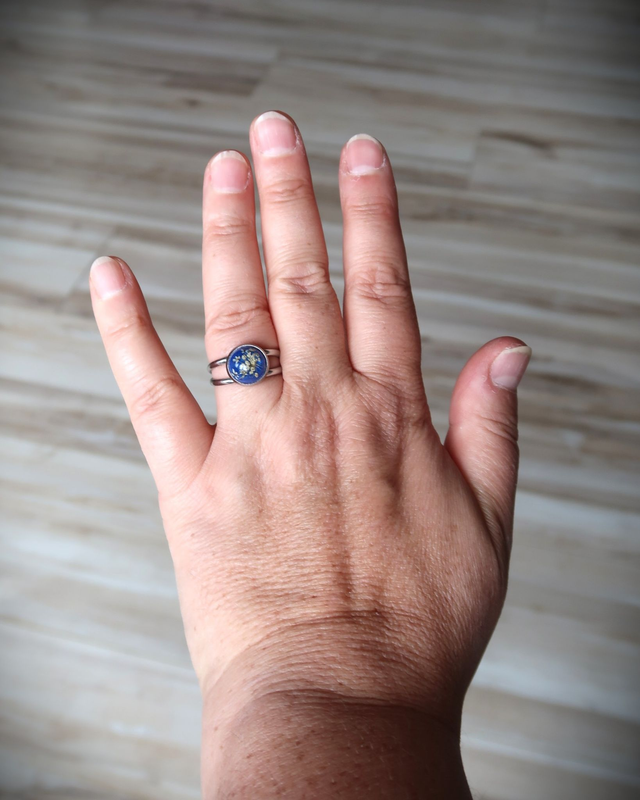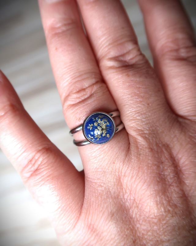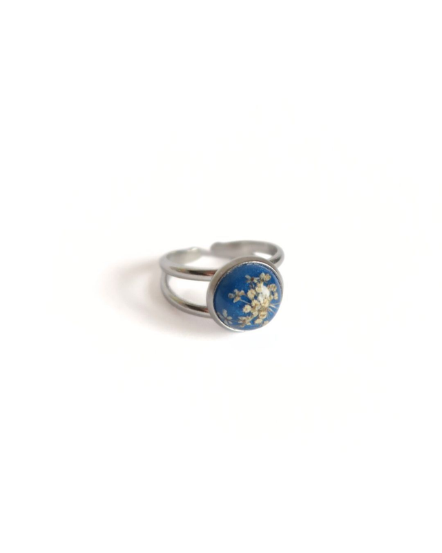 Bague composée d'un cabochon de diamètre 10 mm en résine époxy, colorant blanc et pétales de fleur séchée naturelle. Base en acier inoxydable. Taille unique & réglable.