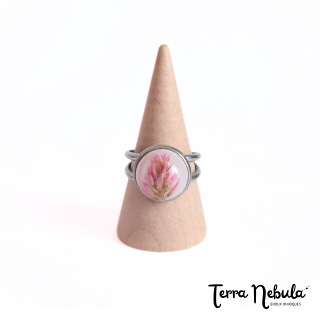 Bague composée d'un cabochon de diamètre 10 mm en résine époxy, colorant blanc, célosie séchée et d'une base en acier inoxydable. Taille unique et réglable. Présentation en écrin noir