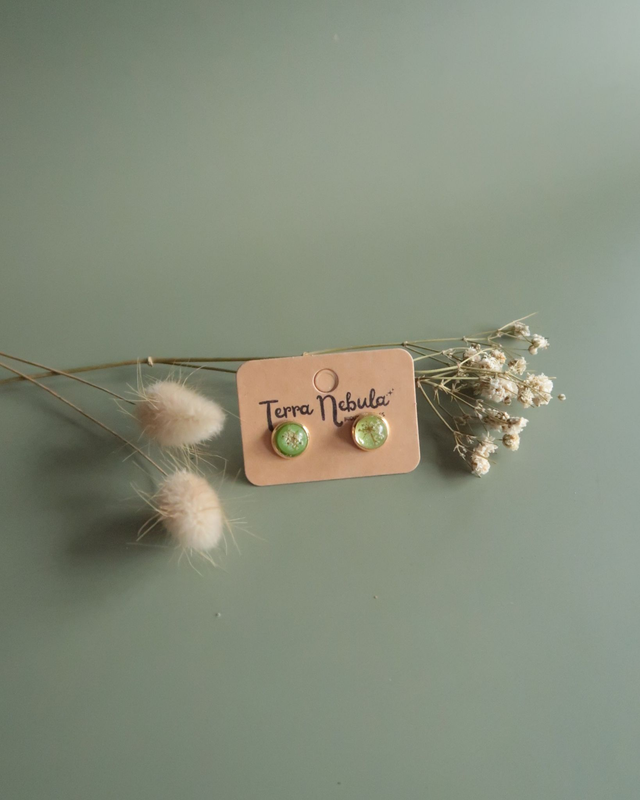 Boucles d'oreilles puces composées de cabochons en résine époxy de diamètre 8 mm, colorant et fleurs de carottes sauvages. Acier inoxydable doré.