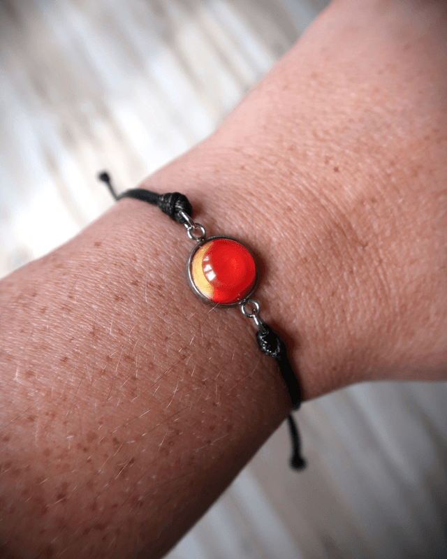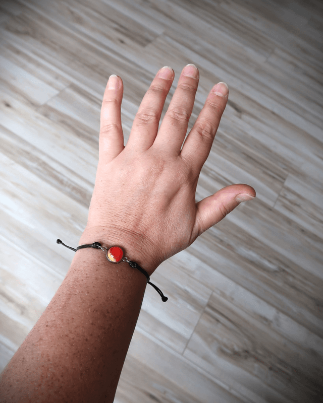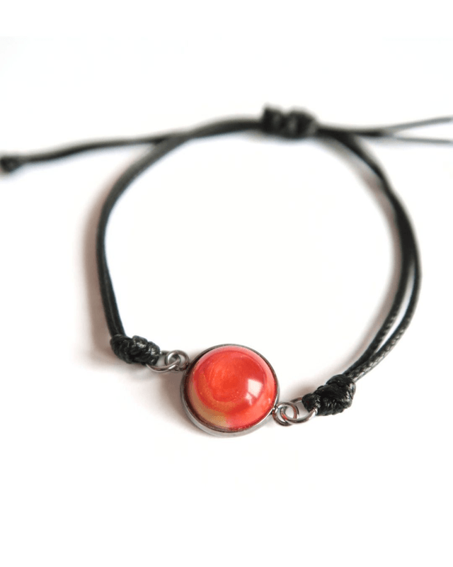 Bracelet composé d'un cabochon de diamètre 12 mm en résine époxy, colorants. Base en acier inoxydable. Cordon noir : taille unique & réglable.
