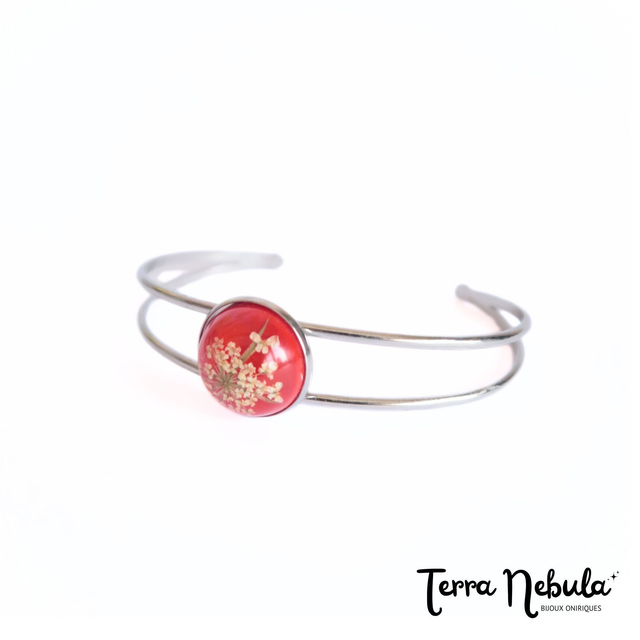 Bracelet composé d'un cabochon (16mm) en résine époxy, colorant rouge et fleurs de carottes sauvages séchées, bracelet en acier inoxydable. Taille réglable.