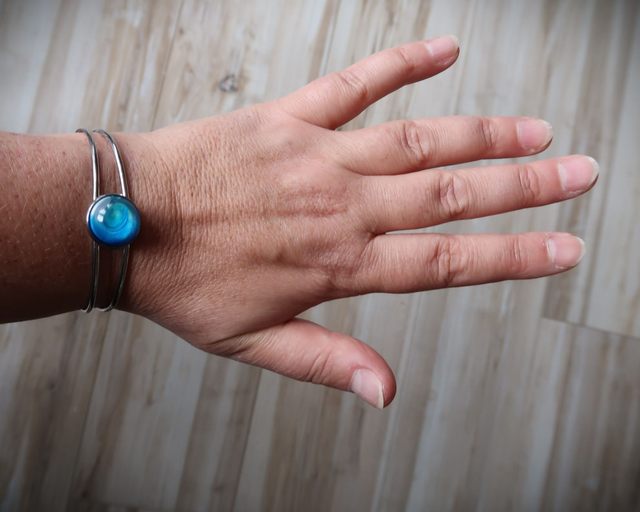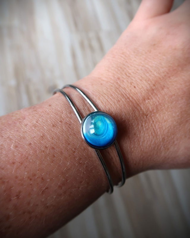 Bracelet composé d'un cabochon (16mm) en résine époxy, colorants, base en acier inoxydable. Taille réglable.