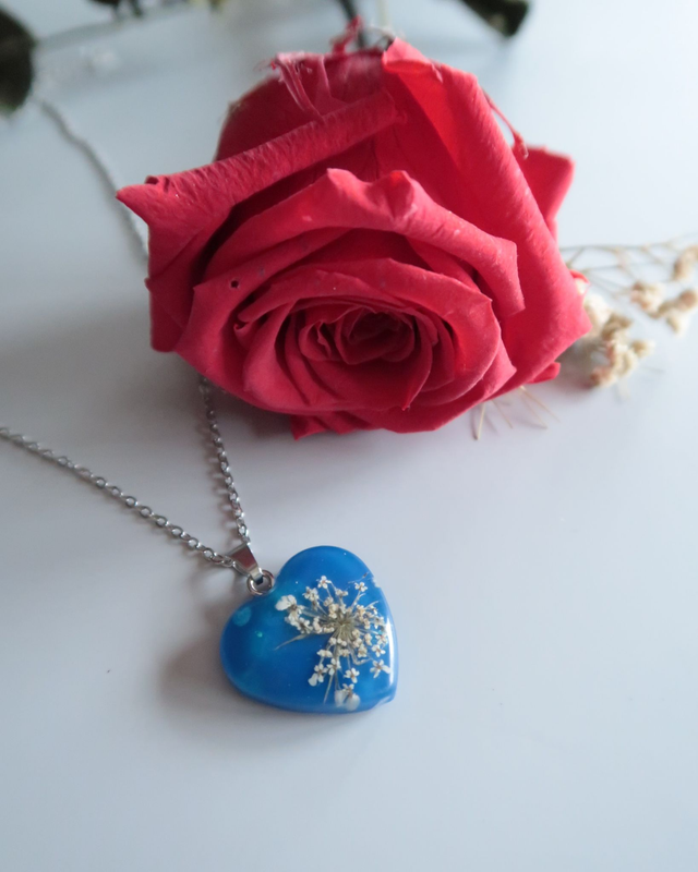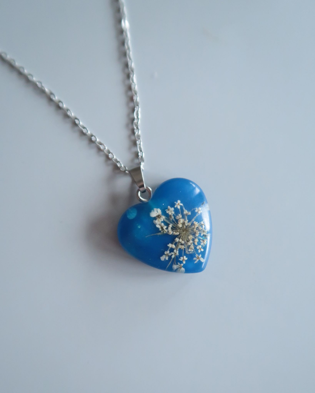 Collier composé de résine époxy, colorant, fleurs de carottes sauvages et acier inoxydable.