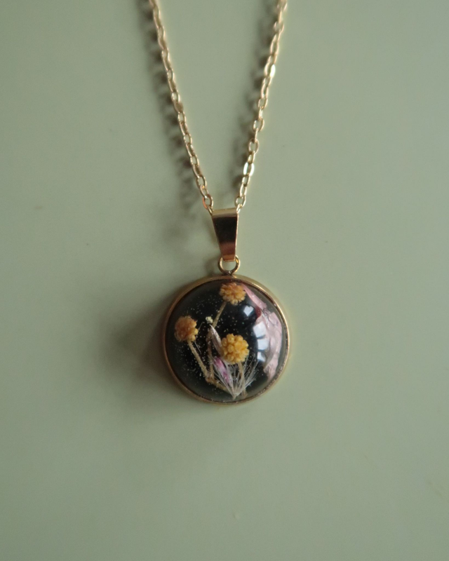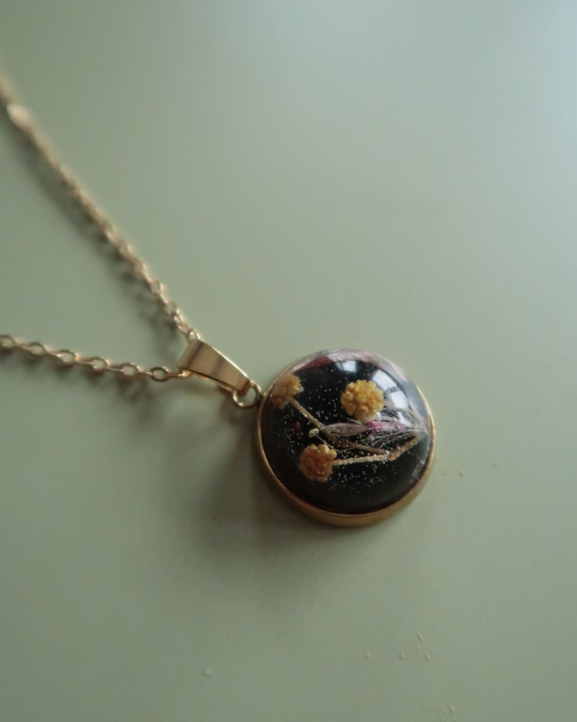 Collier fleuri composé de résine époxy, colorant noir, fleurs séchées naturelles, support, belière et chaîne en acier inoxydable doré.