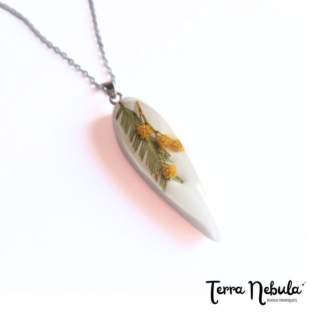 Collier composé de résine époxy, colorant et fleurs de carottes sauvages séchées, bélière en laiton et chaîne acier inoxydable.